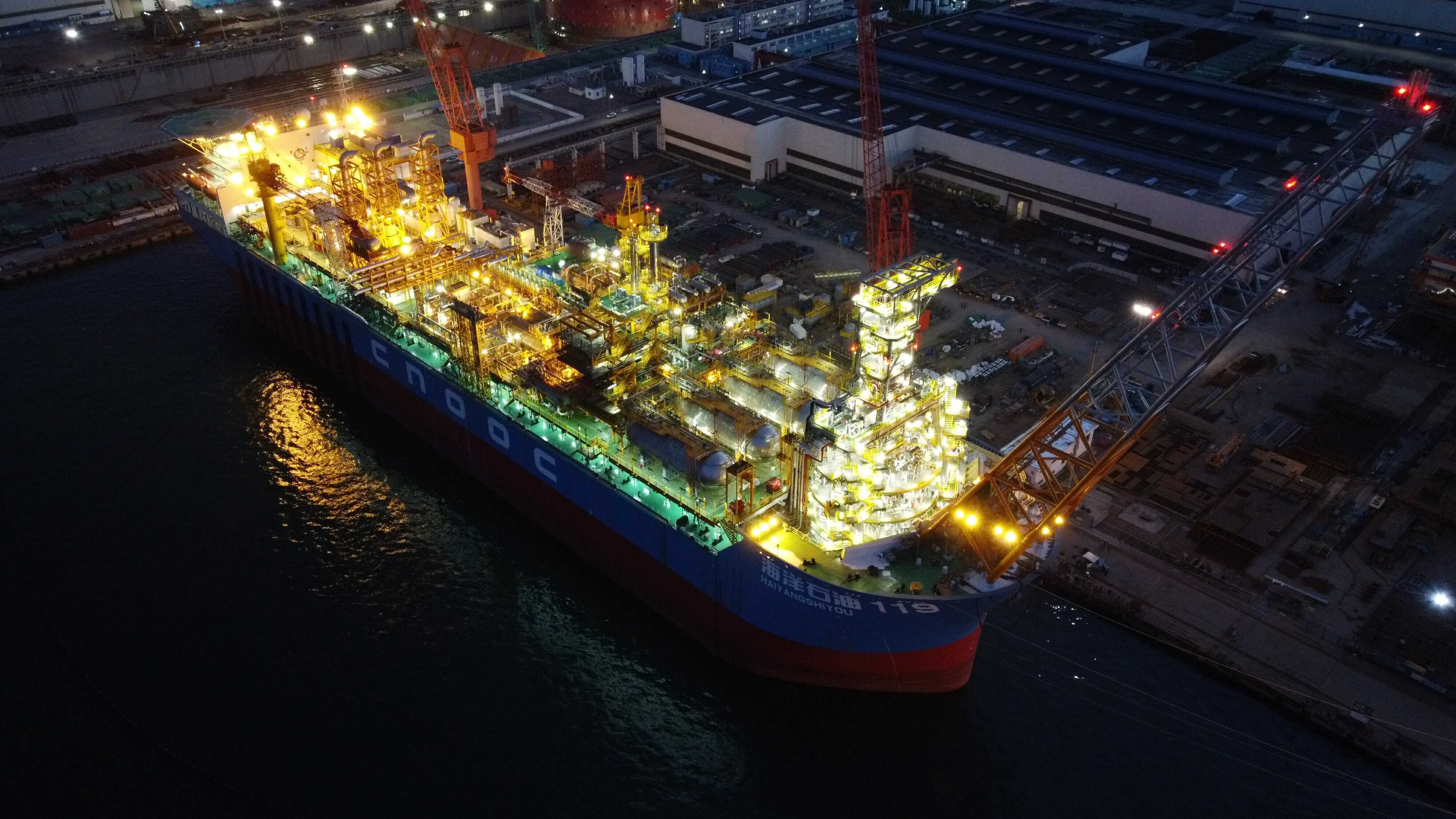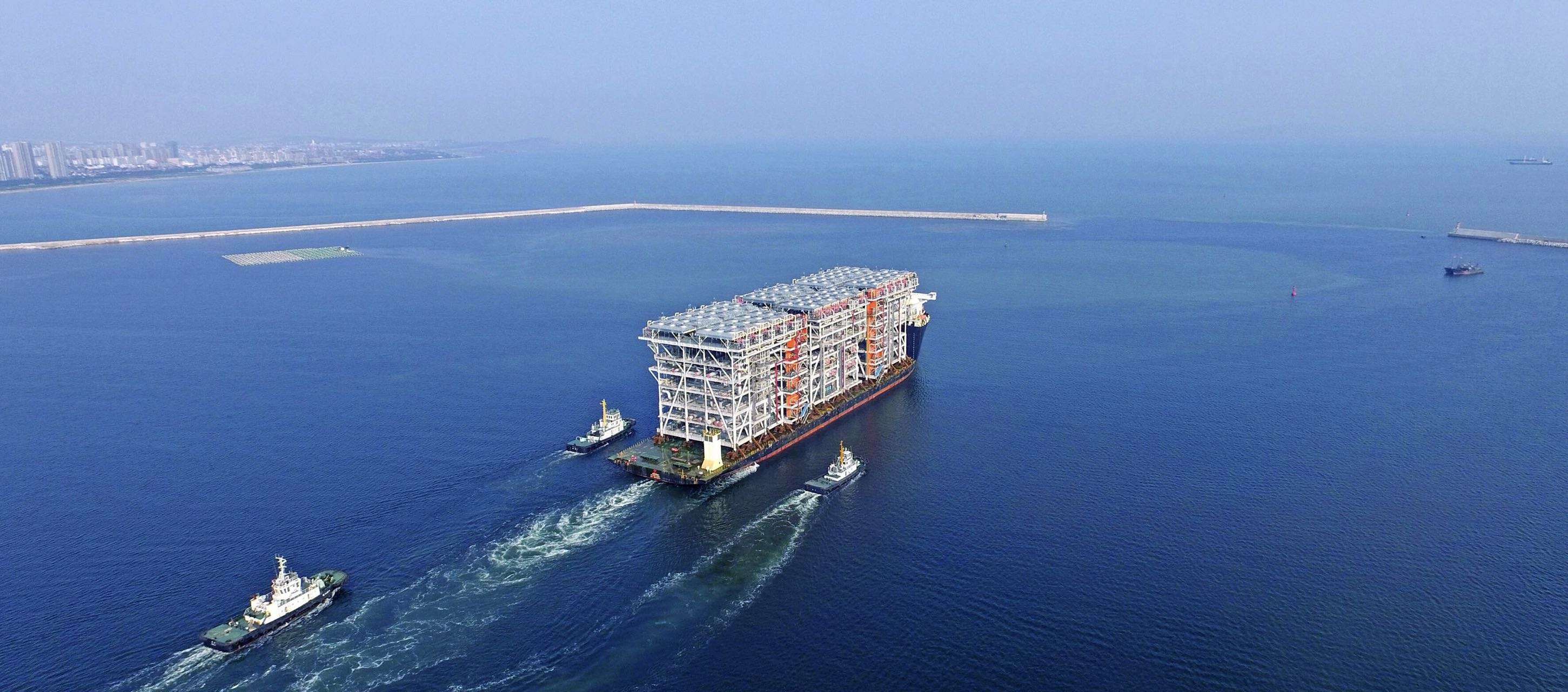 我國渤海最大海上油氣平臺—— 墾利10-2油田群開發項目(一期) 中心處理平臺在山東青島離港起運